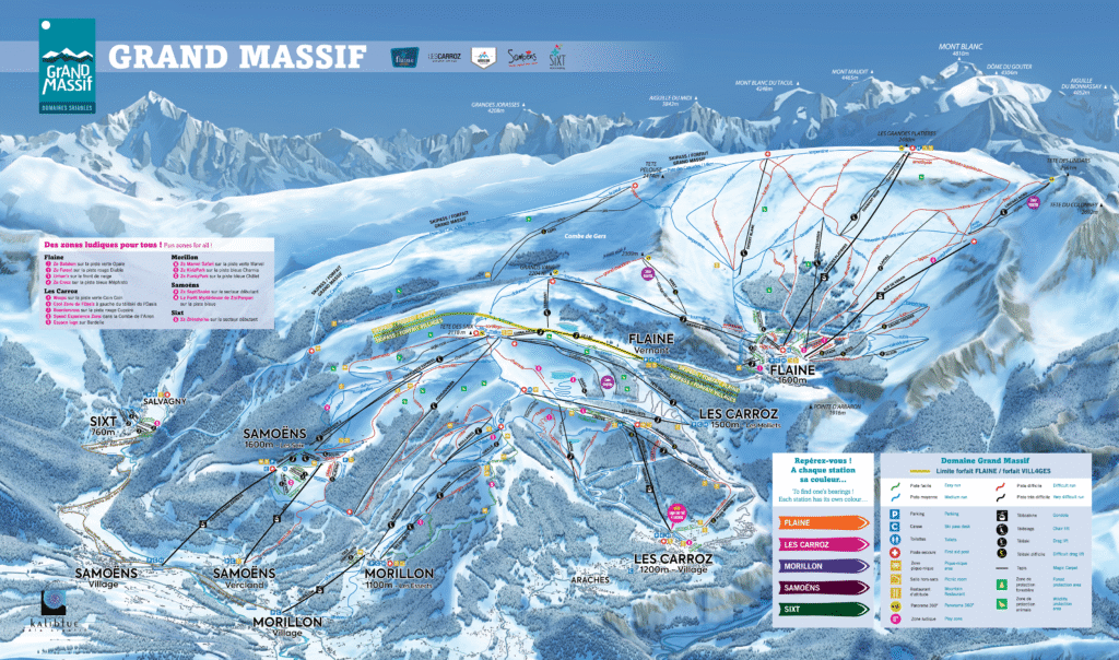 Le domaine propre aux Carroz totalise 33 km de pistes réparties sur 29 tracés. On y trouve environ 2 pistes vertes, 17 pistes bleues, 8 pistes rouges et 3 pistes noires, ce qui en fait un secteur particulièrement adapté aux skieurs débutants et intermédiaires. La station est reliée au Grand Massif — avec Flaine, Morillon, Samoëns et Sixt — donnant accès à un ensemble de 265 km de pistes entre le lac Léman et le massif du Mont-Blanc.