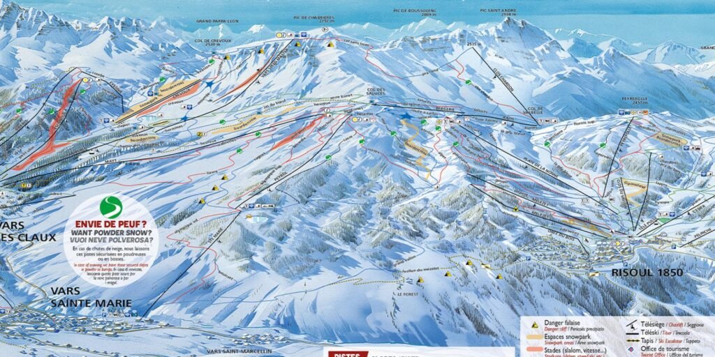 Vars s’étend de 1 650 m à 2 750 m d’altitude et propose 100 km de pistes réparties sur 111 tracés : 18 vertes, 50 bleues, 33 rouges et 10 noires. La plus longue descente atteint 8 km, permettant de profiter pleinement des paysages exceptionnels et des panoramas sur le Lac de Serre-Ponçon. Le domaine, appelé la Forêt Blanche, offre une grande variété de pistes adaptées à tous les niveaux et un enneigement fiable grâce à sa situation en haute altitude.